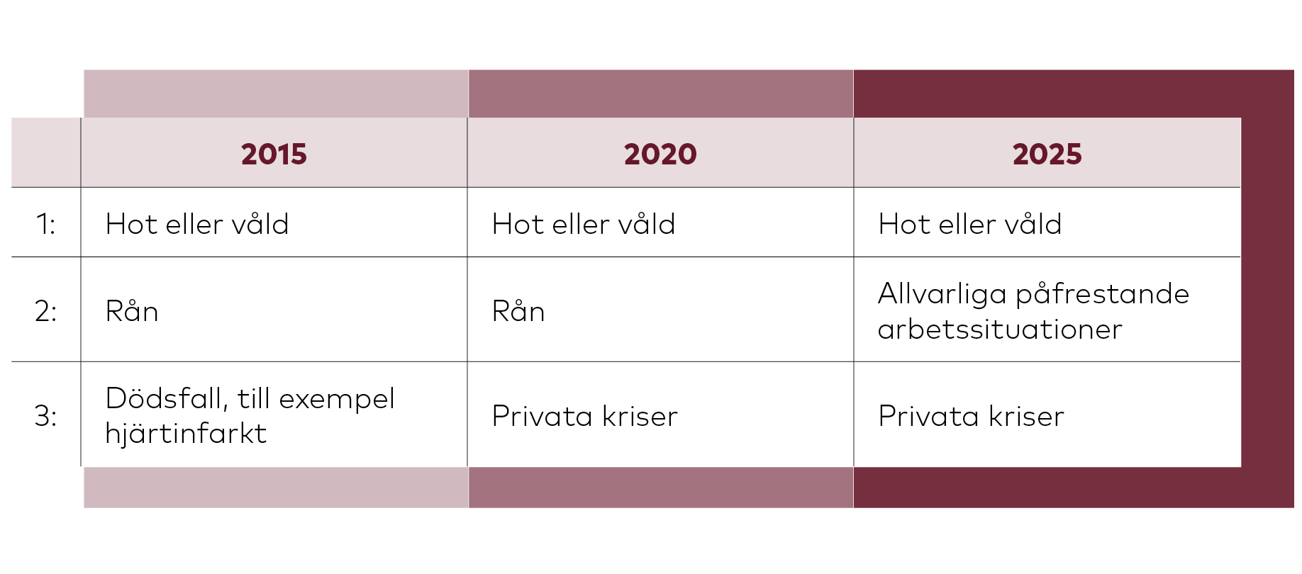 Tabell över de vanligaste orsakerna till aktivering av Falcks krisstöd 2015, 2020 samt 2025