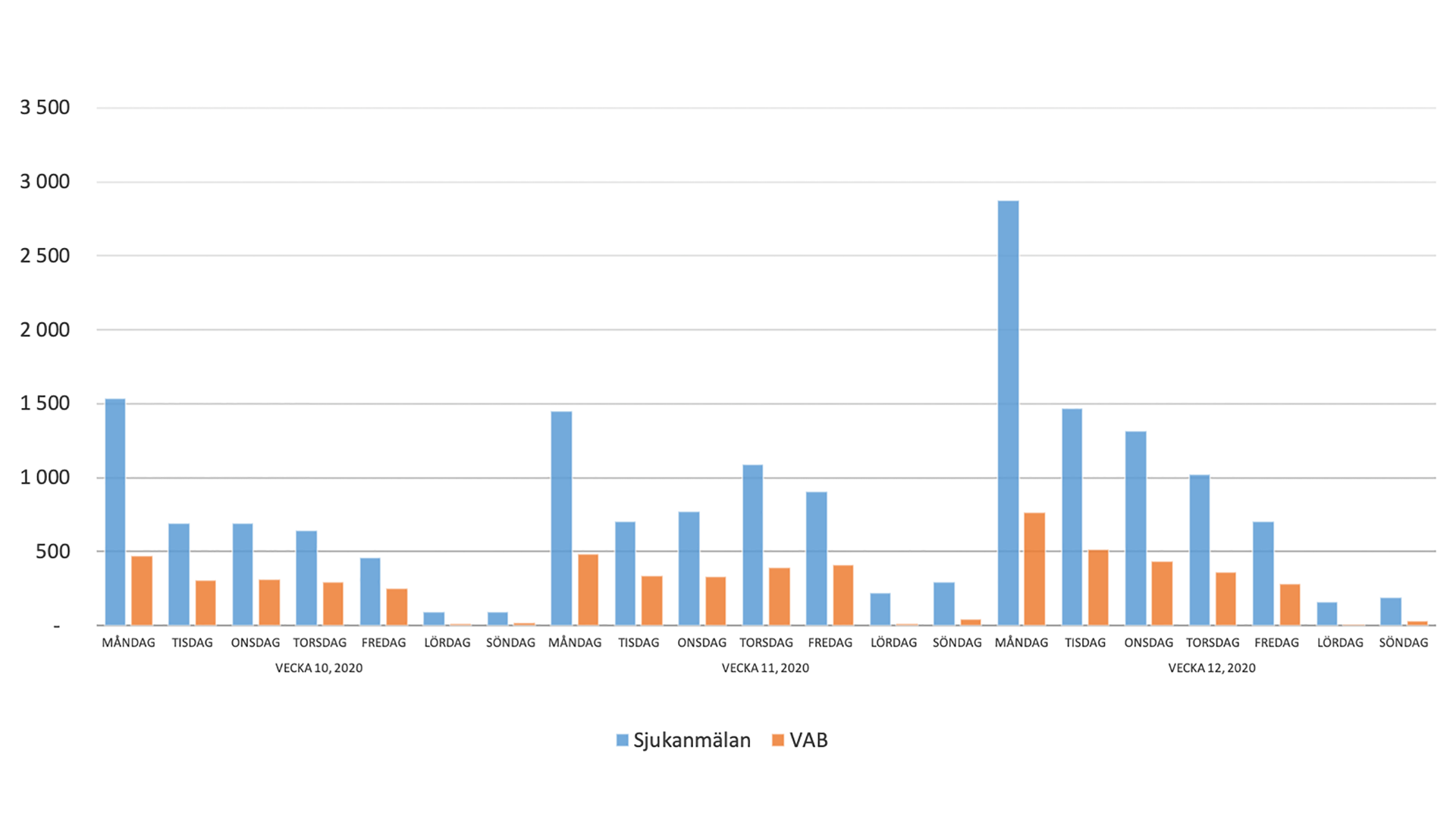 I direkt anslutning till att regeringen aviserat borttaget karensavdrag och att myndigheterna samtidigt gjort starka uppmaningar gjordes till svenska folket att stanna hemma även vid mildare sjukdomssymptom inföll en kraftig ökning av antalet sjukskrivningar över landet som höll i sig i cirka en vecka. Därefter skedde en viss avmattning av inflödet under slutet av vecka 12. Sammantaget är dock sjukskrivningsnivån långt över normalt.