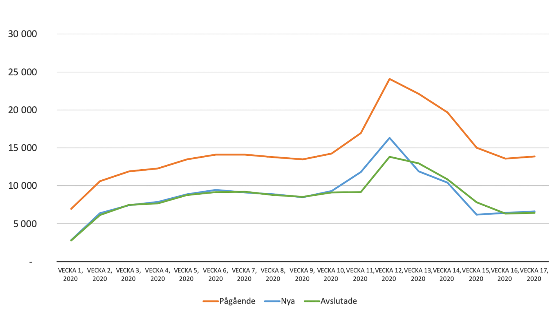Efter rekordmånga sjukanmälningar veckan 12, var de senaste veckorna 16 och 17 lika många nya som avslutade frånvaroärenden. Utplaning av sjuktrenden sker både som ett resultat av minskade nya sjukanmälningar och att en ökande andel av de som varit långtidssjuka med förkylningssymptom nu börjar tillfriskna.